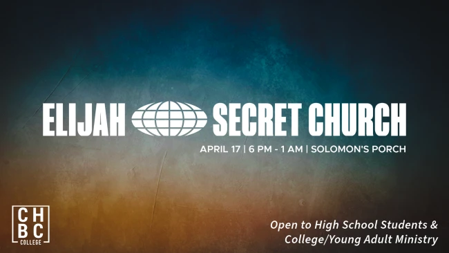 Highschool students and College Young Adult Ministry, join us Friday, April 17th from 6 PM to 1 AM for Secret Church. Secret Church is a 6 hour Bible Study with David Platt. This year the topic is the story of Elijah. For more information contact Pastor Jason, Jennifer Crosby or Jake Cribbs.