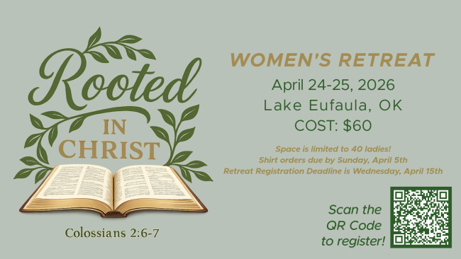 Ladies, have you registered for our Women's Retreat in April! The cost for the weekend is $60 plus a cost for shirt and or a sweatshirt. The theme for this retreat will be "Rooted In Christ Through Seasons of Life." Registration is now open! Sign up early as space is limited to only 40 ladies. Contact Melissa Suttle or Deanna Huff for more information. Deadline to sign up is April 15th!