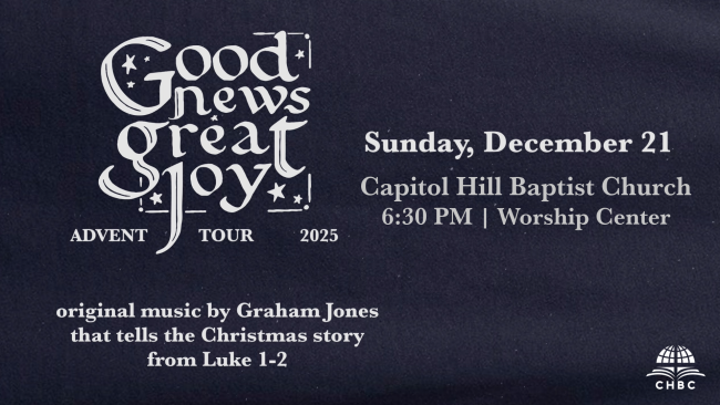 CHBC will be hosting a concert tour called Good News Great Joy on Sunday, December 21 at 6:30 PM. Graham Jones will be performing original music that tells the Christmas story from Luke 1-2. For more information, contact Pastor Brady or the church office.