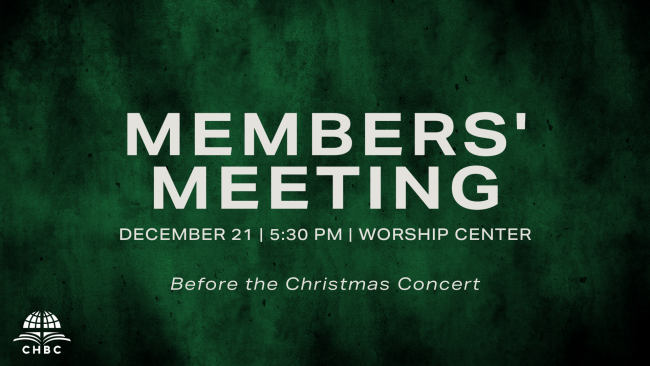 CHBC is a congregational church. Once each quarter we have a regularly scheduled Members’ Meeting during which time we hear from appointed committees or teams to be informed or to make decisions based on their recommendations. It is also when we deal with matters of membership and receive a report on our finances. We encourage every member to be present during Members’ Meetings to be involved in this crucial aspect of local church membership. The next meeting is December 21 at 5:30 PM in the Worship Center, before the Christmas concert.