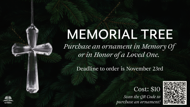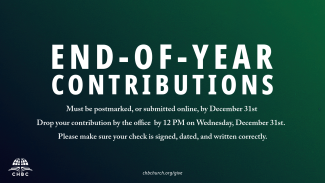 We are thankful for the generous giving of our members to CHBC. Remember, if you would like to give for 2025, those gifts must be postmarked, or submitted online, by 11:59 PM on December 31, 2025. You can also drop your contribution by the office by 12 PM on Wednesday, December 31st. Please make sure your check is signed, dated, and written correctly. Thank you for giving to CHBC!