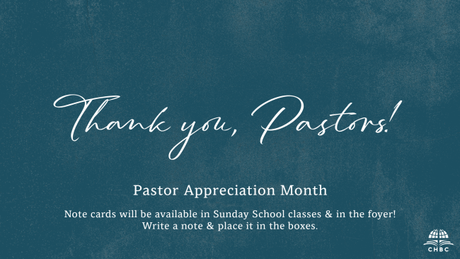 October is Pastor Appreciation Month. The CHBC Missions Team will be providing cards for members to write a thank you note to our pastors. The note cards will be available starting Sunday, September 28th in the foyer, as well as in each Sunday School classes box. Take a few moments to write a thank you note to our pastors and place them in their boxes in the foyer.