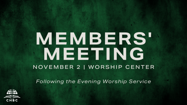 CHBC is a congregational church. Once each quarter we have a regularly scheduled Members’ Meeting during which time we hear from appointed committees or teams to be informed or to make decisions based on their recommendations. It is also when we deal with matters of membership and receive a report on our finances. We encourage every member to be present during Members’ Meetings to be involved in this crucial aspect of local church membership. The next meeting is November 2 at 6 PM in the Worship Center, following the Evening Worship Service.