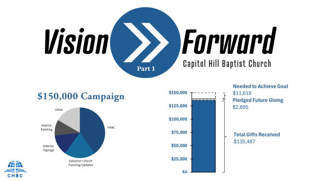Up to $50,000 of giving that exceeds Vision Forward – Part 1 will be moved to the Capital Needs Designated Fund. Any donations that exceed $200,000 for Vision Forward – Part 1, will be moved to the Building Fund, which will be seed money for Vision Forward – Part 2.