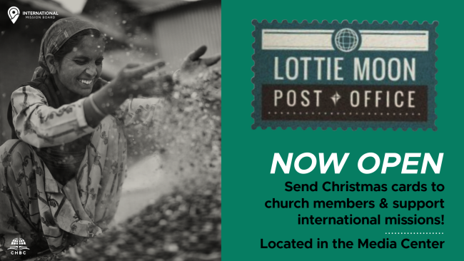Lottie Moon was a missionary to China for 39 years. During her time overseas she wrote back to churches in the states asking for a time of prayer and giving for world missions in the month of December. You can help support International Missions by giving your Year End Gifts to the Lottie Moon Christmas Offering. The gifts go directly to the over 3,900 IMB missionaries across the globe. You can exchange Christmas cards with other CHBC Members that you would normally mail and give that money that would be spent on postage to support International Missions . Drop your cards off in the alphabetized bins located in the Media Center.
