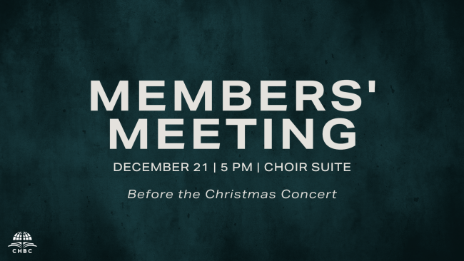 CHBC is a congregational church. Once each quarter we have a regularly scheduled Members’ Meeting during which time we hear from appointed committees or teams to be informed or to make decisions based on their recommendations. It is also when we deal with matters of membership and receive a report on our finances. We encourage every member to be present during Members’ Meetings to be involved in this crucial aspect of local church membership. The next meeting is December 21 at 5:30 PM in the Choir Suite, before the Christmas concert.